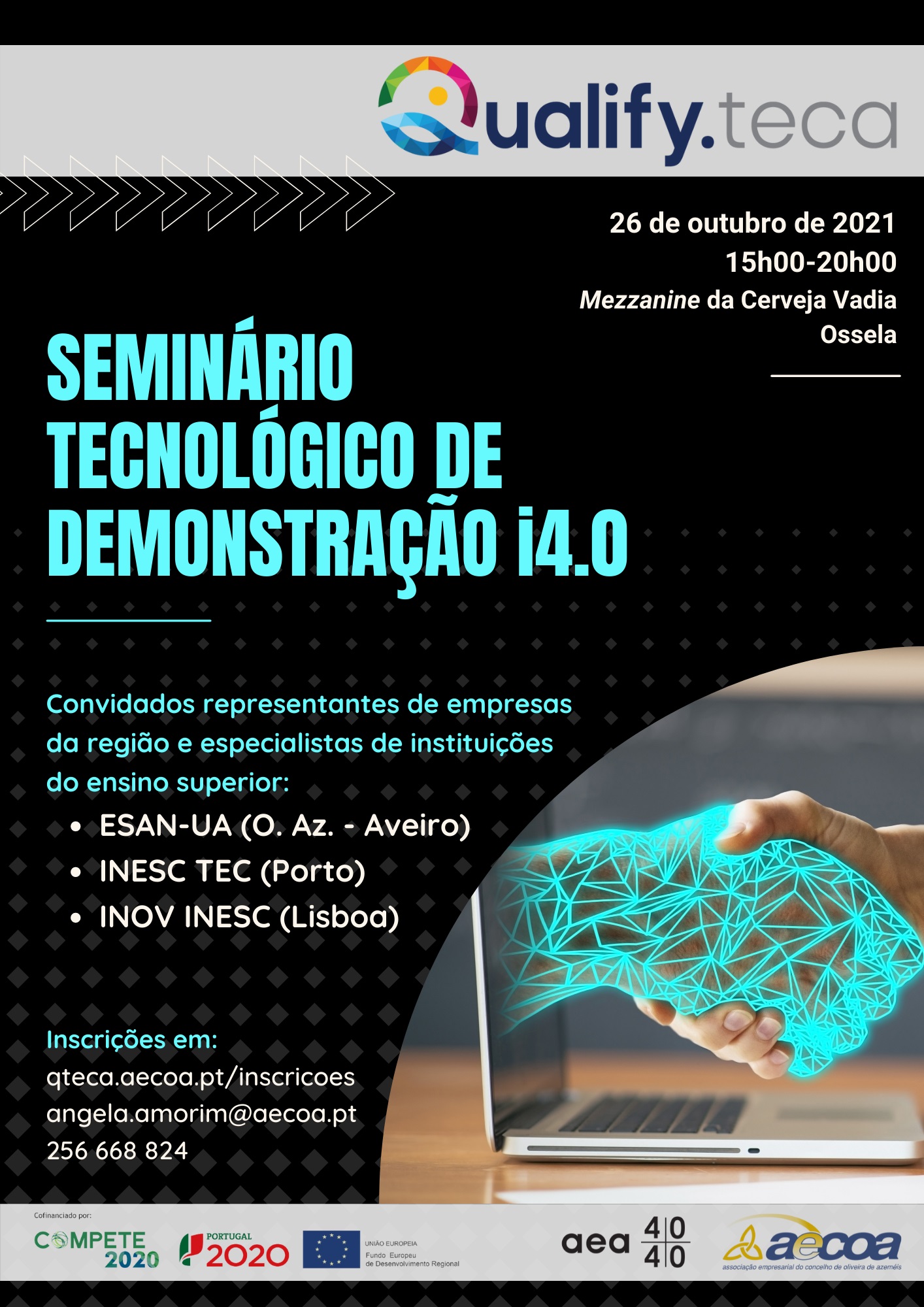 A AECOA - Associação Empresarial do Concelho de Oliveira de Azeméis vai realizar o Seminário Tecnológico Demonstrador i4.0, no próximo dia 26 de outubro. Esta ação reunirá especialistas de reconhecidas instituições académicas e empresários da região. Trata-se de mais uma iniciativa no âmbito do projeto ‘Qualify.teca’, voltado essencialmente para a fileira 'Equipamentos, Serviços e Ingredientes para a Indústria Alimentar'.