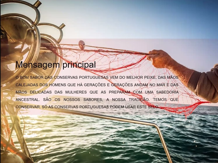 Foi, ainda, apresentada a mensagem da campanha "Vamos Conservar o que é nosso": "O bom sabor das conservas portuguesas vem do melhor peixe, das mãos calejadas dos homens, que há gerações e gerações andam no mar, e das mãos delicadas das mulheres, que as preparam com uma sabedoria ancestral. São os nosso sabores, a nossa tradição. Temos que conservar. Só as conservas portuguesas podem usar este selo".