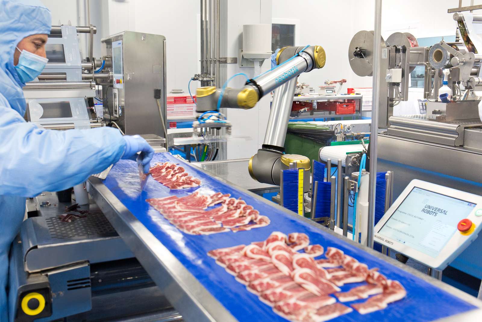 Depois de colocar uma máquina de embalar a vácuo ao lado da cortadora na sala limpa, para encurtar o tempo que decorre entre o corte do presunto e a sua selagem na embalagem, a COVAP viu reduzido também o número de ciclos de produção por minuto a que a máquina funcionava, passando de oito ciclos por minuto para cinco. Ao instalar o cobot com uma aplicação pick-and-place na linha de embalagem, a empresa recuperou o nível de produção anterior.